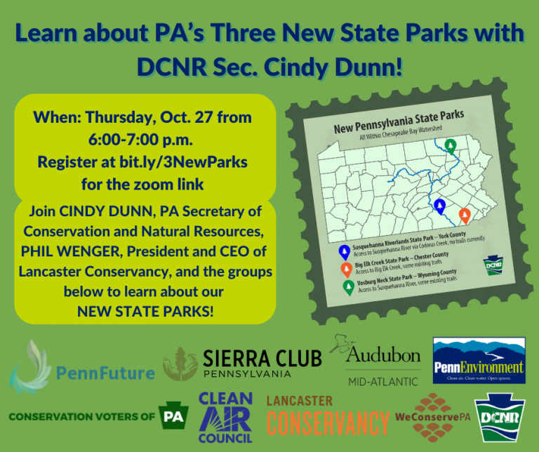 | FreeCurious to learn more about PA’s three new state parks? Join our webinar with the head of Pennsylvania’s state park system, Pennsylvania Department of Conservation and Natural Resources (DCNR) Secretary Cindy Dunn. Learn more about how these three new parks were created, their ecological importance, and how Pennsylvanians can enjoy them.