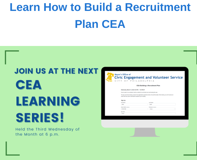 | FreeThe Mayor’s Office of Civic Engagement and Volunteer Service will host a Civic Engagement Academy Learning Series on Wednesday, March 15. This month’s topic will be Building a Recruitment Plan.