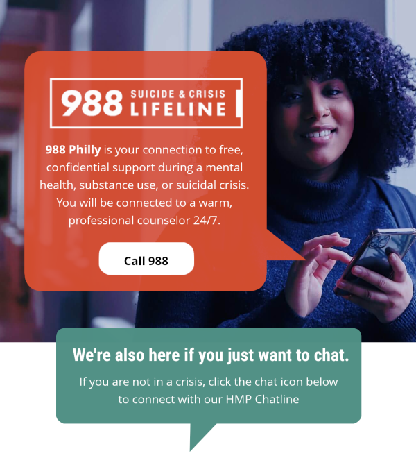 988 Philly is your connection to free, confidential support during a mental health, substance use, or suicidal crisis. You will be connected to a warm, professional counselor 24/7.