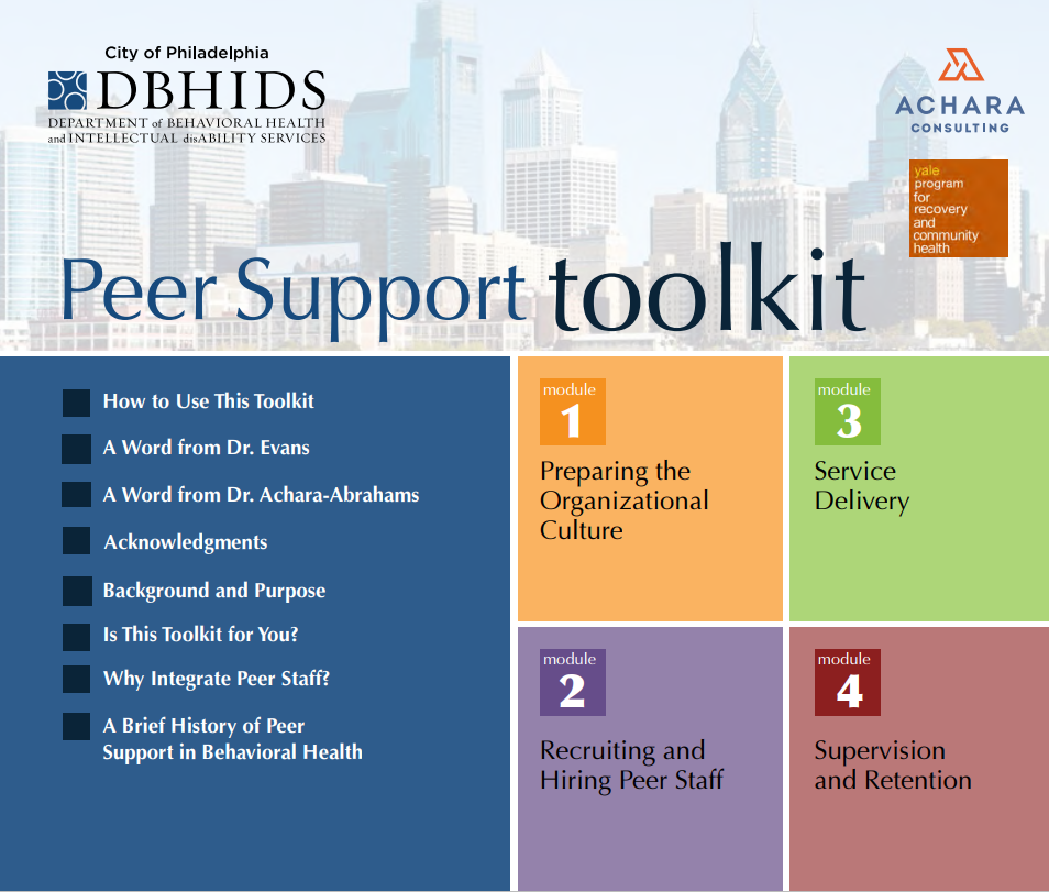 The practices and tools in this toolkit come largely from organizations in Philadelphia that have worked for years to create a recovery-oriented system of care in which peer support services are central. Many of the recommendations are also informed by the literature on peer support services. Many tools have also been developed and field-tested by organizations across the country.