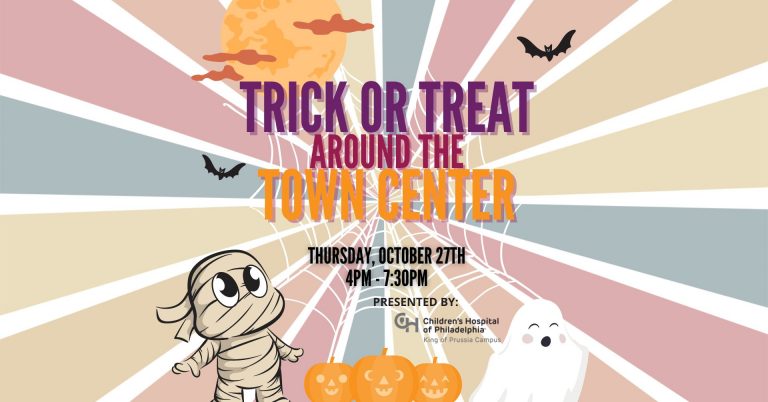 King of Prussia Town Center 155 Village Drive, King of Prussia, PA, United StatesTrick or treaters are invited to show off their costumes, and go tenant-to-tenant collecting candy, sweet treats and more to get an early start on celebrating the Halloween holiday as a community. In addition to trick-or-treating, a DJ, Halloween themed activations, games on the green, and festive decor, will bring the Town Center to life with excitement. This year, candy for the event is sponsored by Paladar Latin Kitchen and Rum Bar, Heart + Paw, and Xfinity by Comcast.