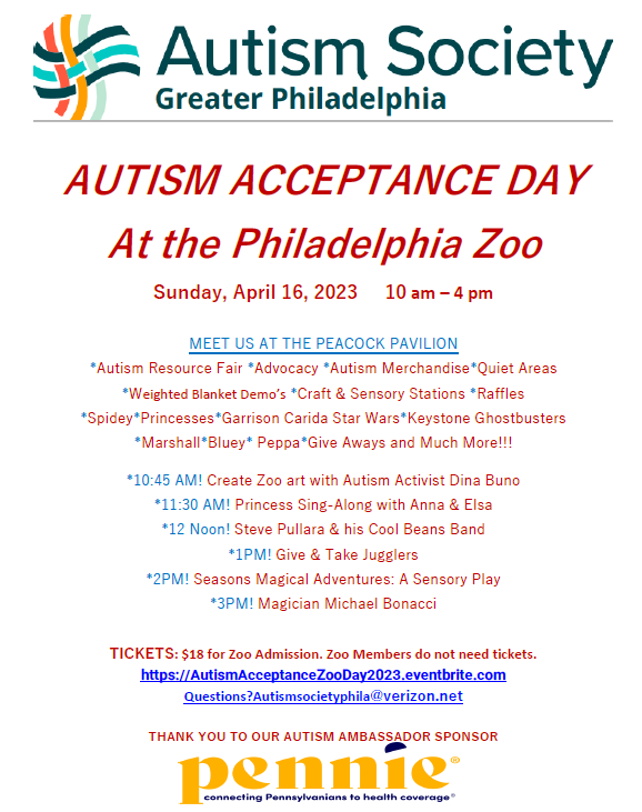 Philadelphia Zoo 3400 W. Girard Ave, Philadelphia, PA, United StatesAn Autism Resource Fair will be held at the Philadelphia Zoo with Autism Activist Dina Buno. Child Guidance Resource Centers will be on site providing free mental health screenings and information about Autism services.