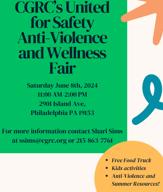 Child Guidance Resource Centers, Southwest Philly Office 2901 Island Ave, Philadelphia, United StatesCELEBRATE START OF SUMMER with free food from Delco Steaks, bouncy castle, carnival games and activities! Our theme - United for Safety - seeks to provide families with a anti-violence resources and wellness fair featuring CGRC's community partners and legislative representatives that work decrease violence and increase wellness in Southwest Philadelphia. This year we will also have speakers presenting on topics to help the community and parents stay informed about reducing violence for at risk youth.